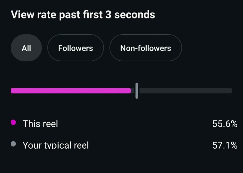 • Engagement Rate – there’s no official “engagement rate” stat, but you can eyeball how many likes, saves, and shares your reel gets compared to how many views it has. If you have high views but low engagement, this signals that you may want to improve the payoff of your reels.
